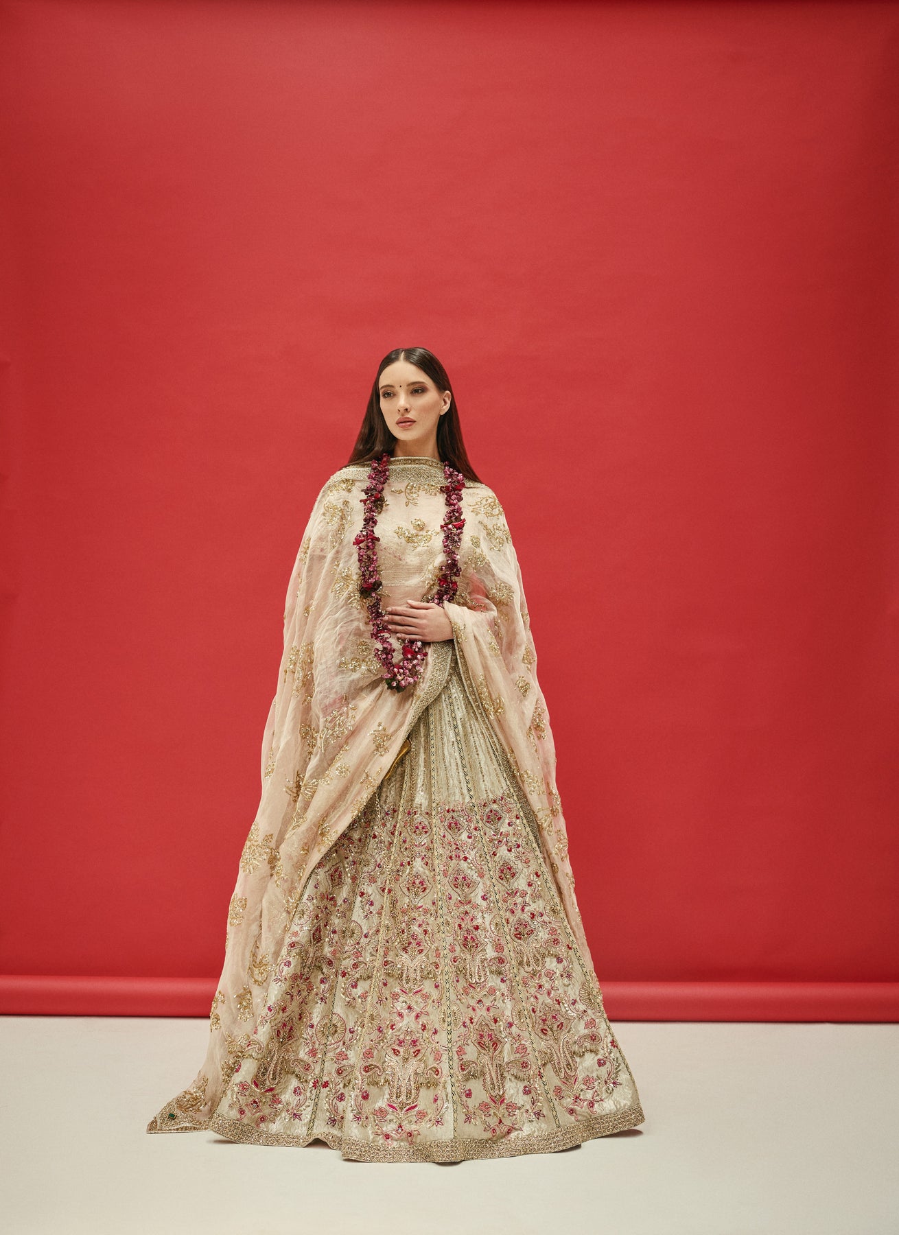 A classic Ektar lehenga paired with Banarasi brocade, complemented by a dupatta adorned with gota patti and sequined workmanship.