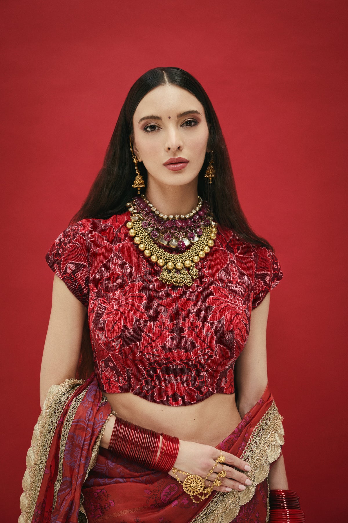 Moti Bharat, or bead embroidery, a craft that involves meticulous hand- stitching of tiny beads to form delicate patterns and textures. The technique brings a three-dimensional sparkle, enhancing the luminous tissue base with subtle rhythm and light play.