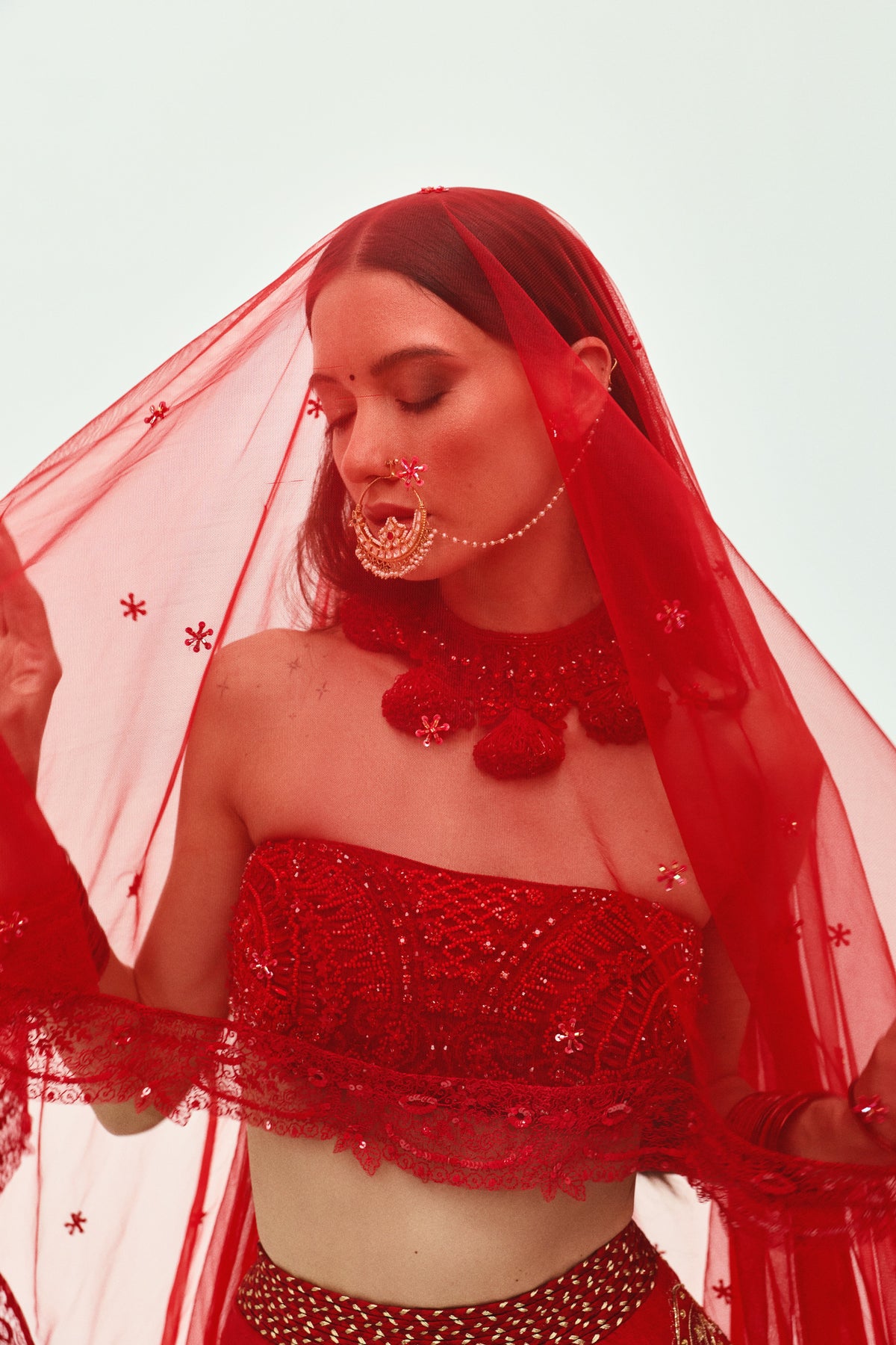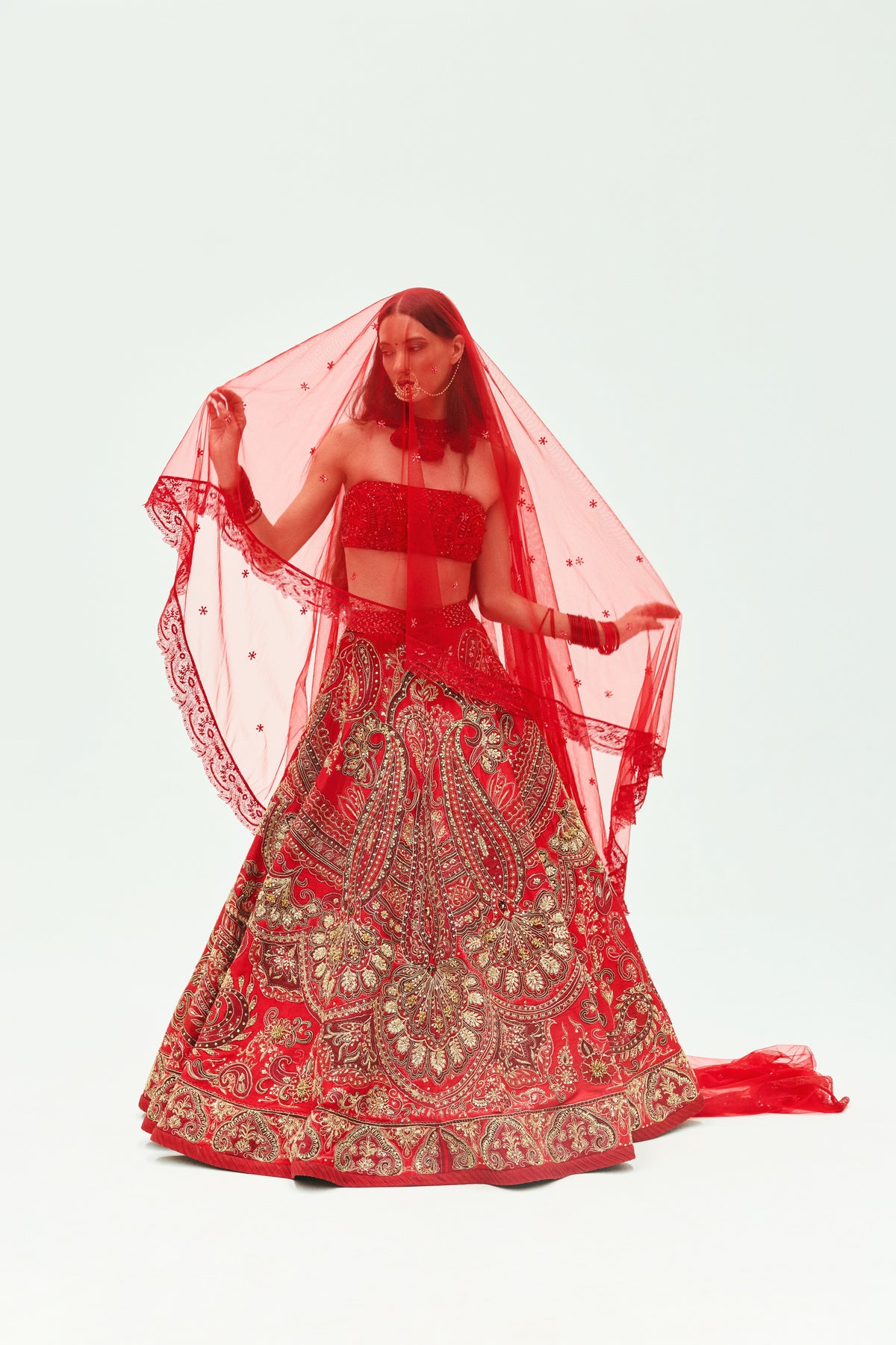 A striking monochromatic red lehenga crafted from multiple fabrics in tonal layers, unified by kasab embroidery. The veil is fashioned from Italian tulle .